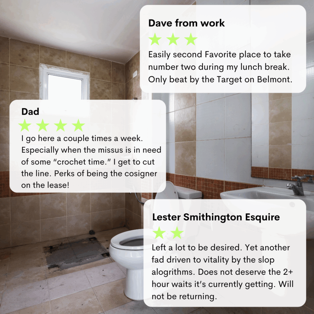 I have be honest. After reading 700+ of the reviews, I am less upset by the mere existence and more bummed by the 3.2 out of 5 average rating. I just can’t understand using someone’s personal bathroom and having a 3/5 experience. Like I understand that Lester Smithington is a bathroom snob (he famously gave the Evanston Chilis a 2/5 in New York Times), but at least he felt strongly one way or the other.