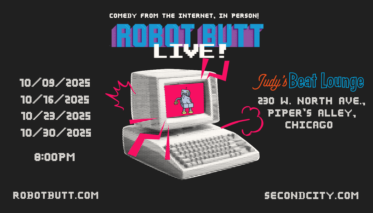 Share Facebook Twitter LinkedIn Pinterest Email Chicago’s absurdist talk show is back! We’re doing four completely different shows with Robot Butt themed bits, improv, crowd-work, stand-up, and a ton of acts way more difficult to describe. Come out and enjoy the chaos. Tickets! Chicago Robot Butt Live second city
