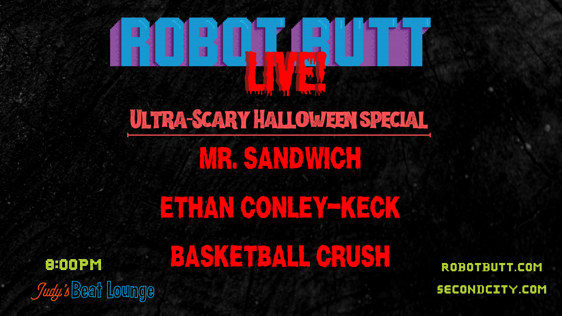 Share Facebook Twitter LinkedIn Pinterest Email We are LIVE at Second City in Judy’s Beat Lounge every Thursday in October. Every show is completely unique, so you don’t want to miss any of them! Tickets at secondcity.com Robot Butt Live!